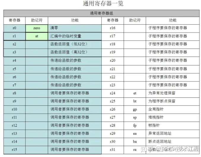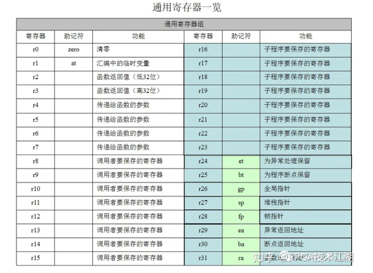 我们通过下面的通用寄存器一览表来了解 Nios II 的 32 个通用寄存器: