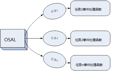 因此,在协议找中,OSAL负责调度各个任务的运行,如果有事件发生了,则会调用相应的事件处理函数进行处理。OSAL的工作原理示意图如图所示: