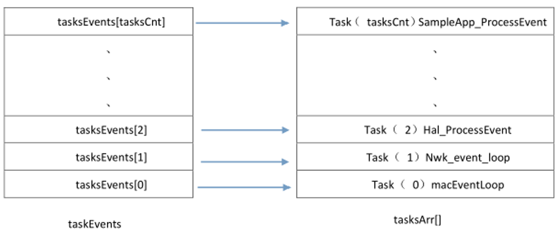 变量idx用来在事件表中索引,函数osalTimeUpdate()和Hal_ProcessPoll()则用来更新时钟,并查看硬件方面是否有时间发生,如串口接收、按键闭合等。Do-while循环则一直查看是否有事件,若有则break跳出,进行处理。tasksEvents是指向事件表首地址的指针,而tasksArr是存放事件处理函数指针的数组。有事件发生时,变量events从tasksEvents中获取需要处理的事件,编号为idx,然后通过tasksArr调用相应的事件处理函数,编号也为idx,不难看出,事件表与函数表存在着对应的关系,如图: