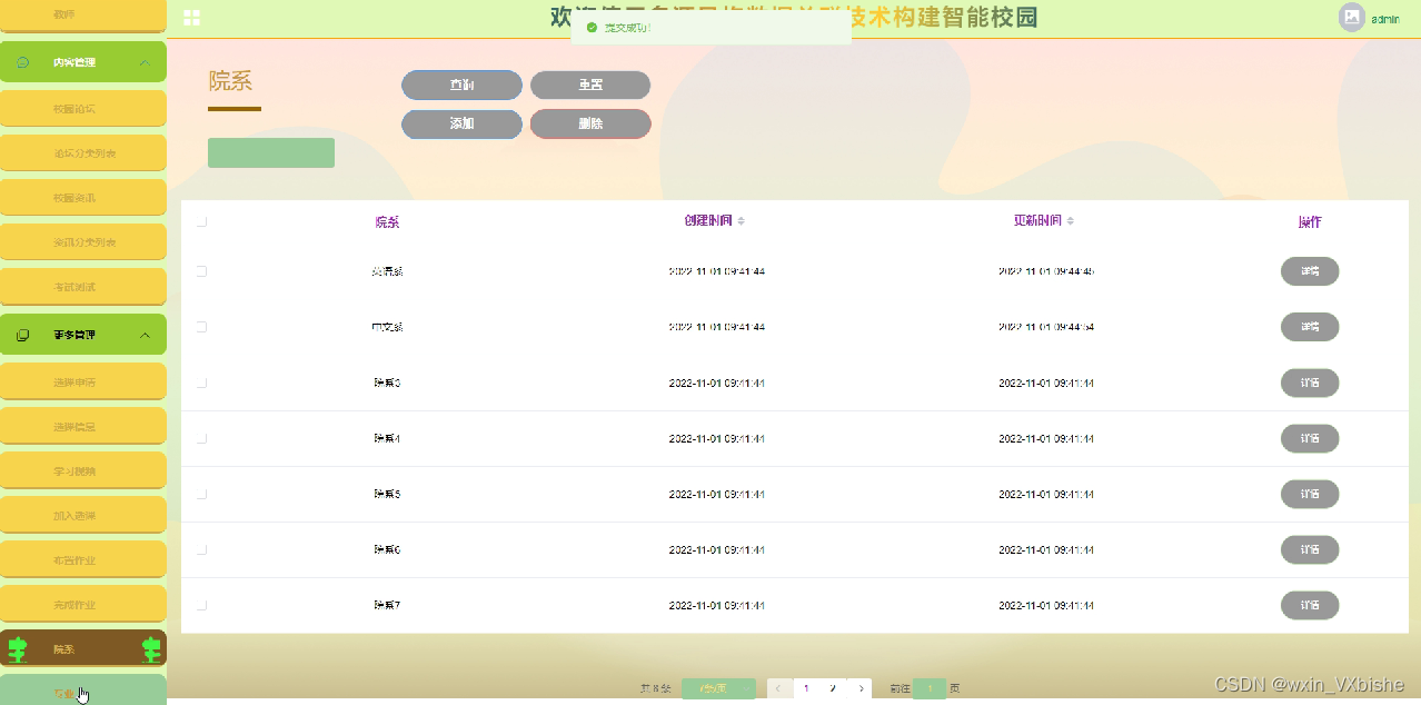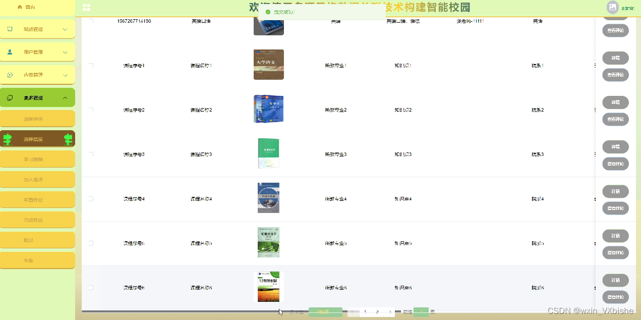 本选题则旨在通过标签分类管理等方式,实现管理员,教师,学生三种用户需求,包含以下的功能首页,站点管理,用户管理(管理员,教师,学生),内容管理(校园论坛,论坛分类列表,校园资讯,资讯分类列表,考试测试),更多管理(选课申请,选课信息,学习视频,加入选课,布置作业,完成作业,院系,专业),从而实现线上学习,选课,完成作业,考试等需求。