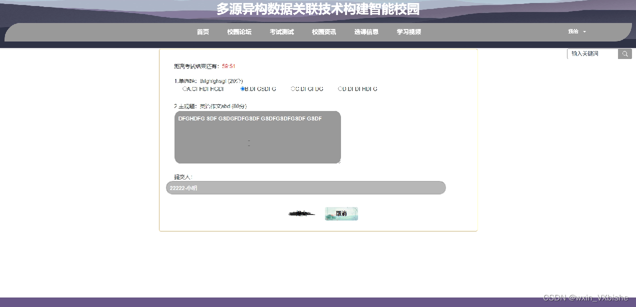 考试测试,在此页面可以参加考试,答题,提交考卷及查看成绩等,如图5-14所示。