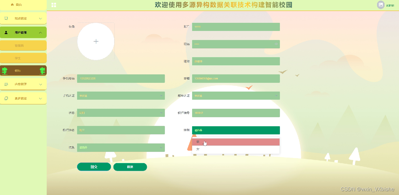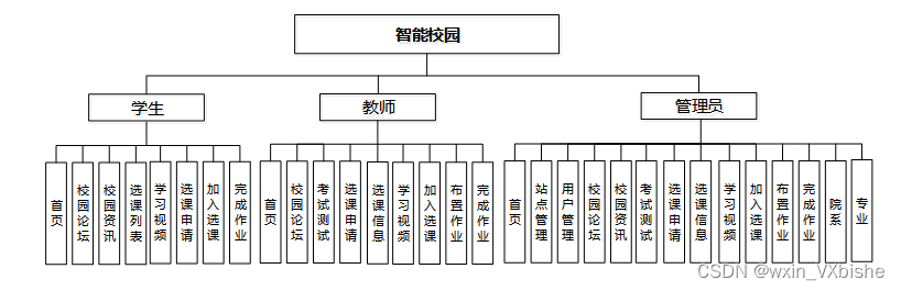 (1)功能要求:可以管理首页,站点管理,用户管理(管理员,教师,学生),内容管理(校园论坛,论坛分类列表,校园资讯,资讯分类列表,考试测试),更多管理(选课申请,选课信息,学习视频,加入选课,布置作业,完成作业,院系,专业)等功能模块。