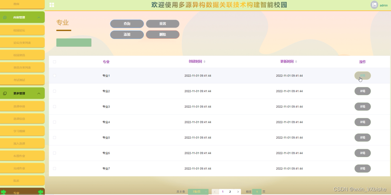 专业管理,管理可以查看各院系专业信息,可以增删改等维护操作,如图5-8所示。