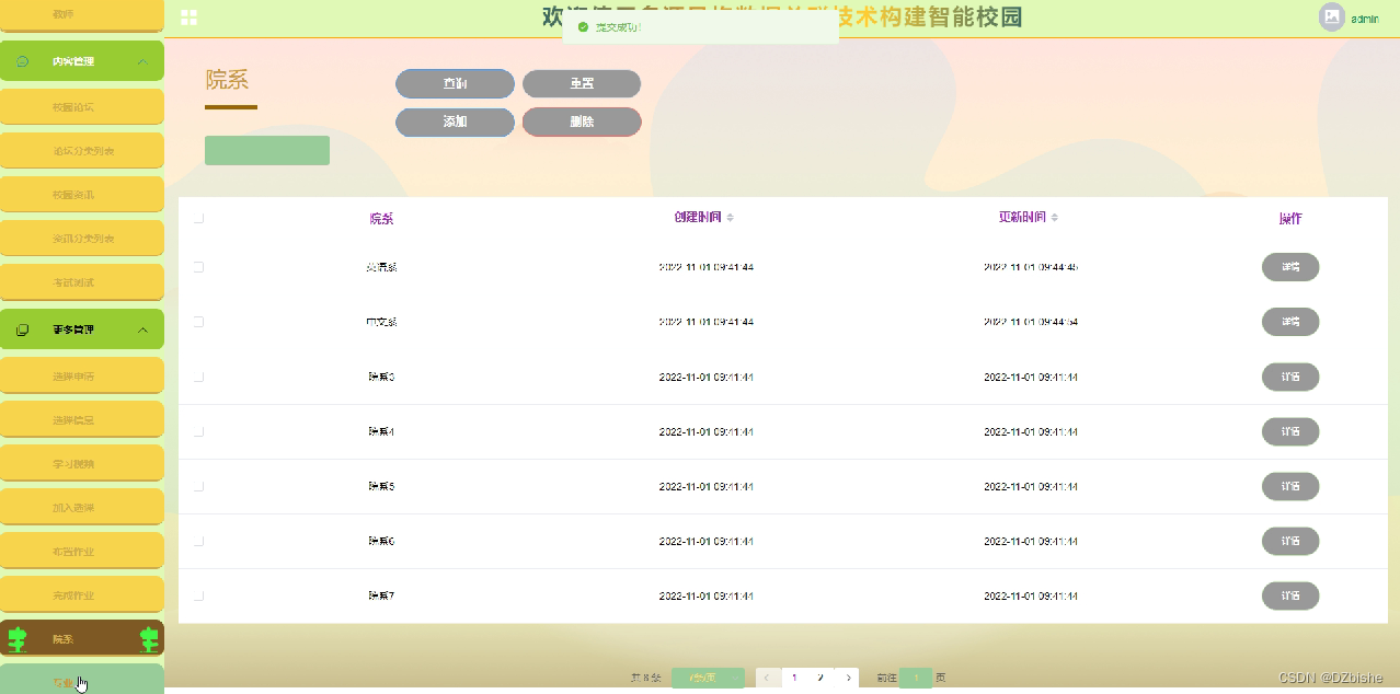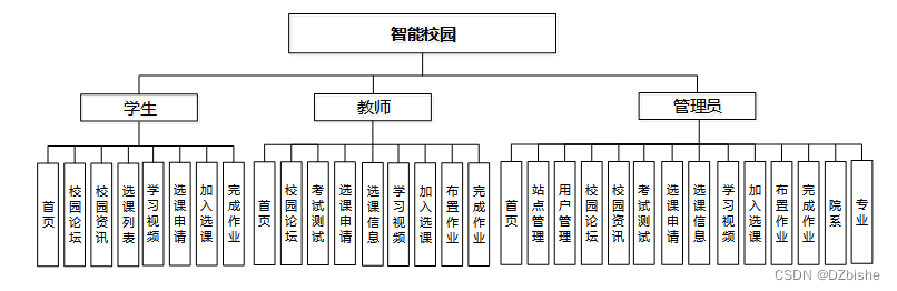 (1)功能要求:可以管理首页,站点管理,用户管理(管理员,教师,学生),内容管理(校园论坛,论坛分类列表,校园资讯,资讯分类列表,考试测试),更多管理(选课申请,选课信息,学习视频,加入选课,布置作业,完成作业,院系,专业)等功能模块。