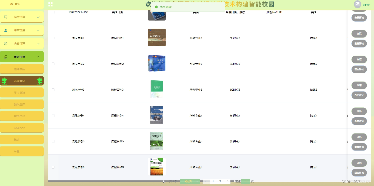 本选题则旨在通过标签分类管理等方式,实现管理员,教师,学生三种用户需求,包含以下的功能首页,站点管理,用户管理(管理员,教师,学生),内容管理(校园论坛,论坛分类列表,校园资讯,资讯分类列表,考试测试),更多管理(选课申请,选课信息,学习视频,加入选课,布置作业,完成作业,院系,专业),从而实现线上学习,选课,完成作业,考试等需求。