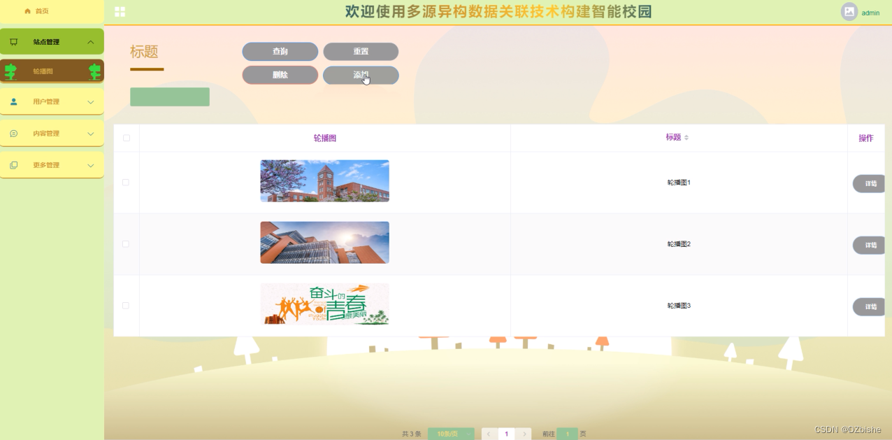 系统所要实现的功能分析,对于现在网络方便的管理,系统要实现用户可以直接在平台上进行查看所有数据信息,根据需求可以进行在线添加,删除或修改多源异构数据关联技术构建智能校园信息,这样既能节省时间,不用再像传统的方式耽误时间,真的很难去满足用户的各种需求。所以多源异构数据关联技术构建智能校园的开发不仅能满足用户的需求,还能减少原有不必要的工作量,大大提高了管理员的工作效率。