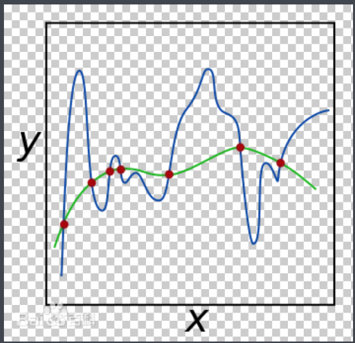 这样做后,我们通过曲线来预测或者表示原图像的时候,结果势必就会有误差,如果没有误差会是什么呢?那就是说我们找了一条和图中蓝色曲线一模一样的线来表示蓝色的线,也就是说我们把一些有噪音的点也表示出来了,这种行为放在卷积中就叫做过拟合,而在卷积中,相比较于过拟合曲线,我们更希望有一条正则化的曲线。换句话说,正则化的作用就是为了防止过拟合。那么Dropout是怎么实现过拟合的呢?