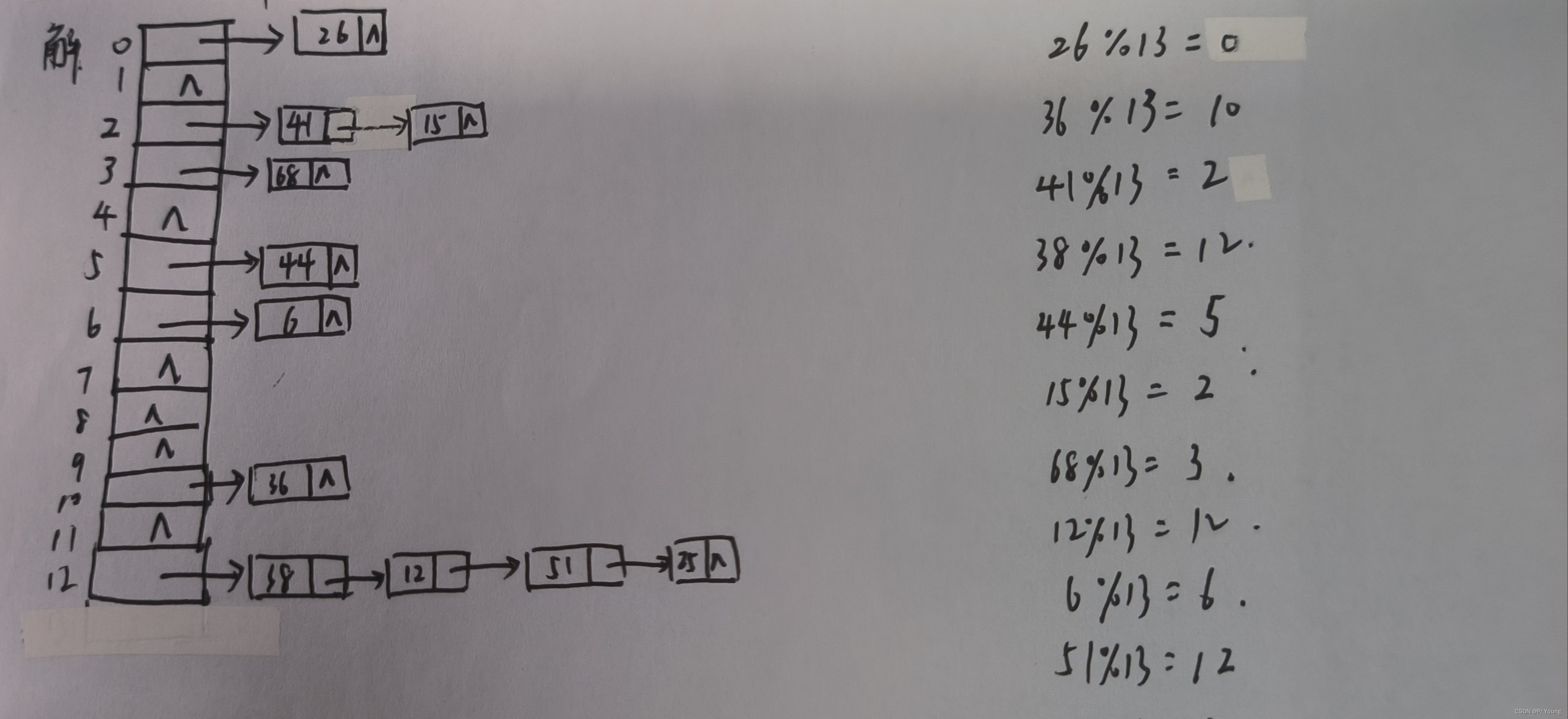 一组关键字{26,36,41,38,44,15,68,12,6,51,25},用链地址法解决冲突,散列表长度为15,散列函数为Hash(key)=key%13