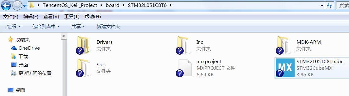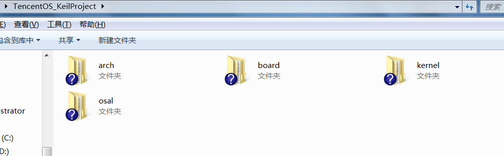 如图所示,新建TencentOS_tiny主目录,并在主目录下添加四个子目录,其中arch、kernel、osal从代码仓直接拷贝过来即可,而board目录下则放入我前面使用STM32CubeMX 工具生成的裸机工程代码,如下图所示: