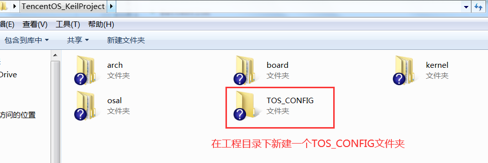在工程目录下,新建一个TOS_CONFIG文件夹,同时创建一个tos_config.h文件,用来存放TencentOS tiny的配置头文件。