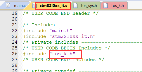 修改stm32l0xx_it.c的中断函数,在stm32l0xx_it.c文件中包含 tos_k.h 头文件