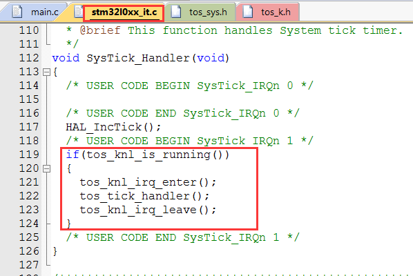 {/* USER CODE BEGIN SysTick_IRQn 0 *//* USER CODE END SysTick_IRQn 0 */HAL_IncTick();/* USER CODE BEGIN SysTick_IRQn 1 */if(tos_knl_is_running()){tos_knl_irq_enter();tos_tick_handler();tos_knl_irq_leave();}/* USER CODE END SysTick_IRQn 1 */