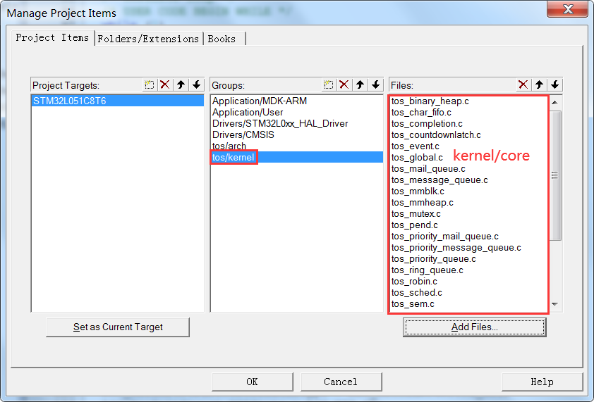 把kernel目录下中的core和pm两个文件夹所有.c文件添加进来即可,其中Core下为基础内核,如何还没涉及