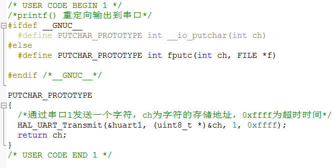#else#define PUTCHAR_PROTOTYPE int fputc(int ch, FILE *f)#endif /*__GNUC__*/PUTCHAR_PROTOTYPE