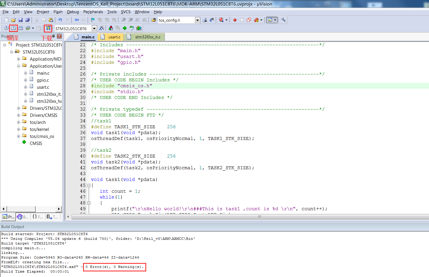 在mian.c 中添加TencentOS tiny 头文件,编写任务函数