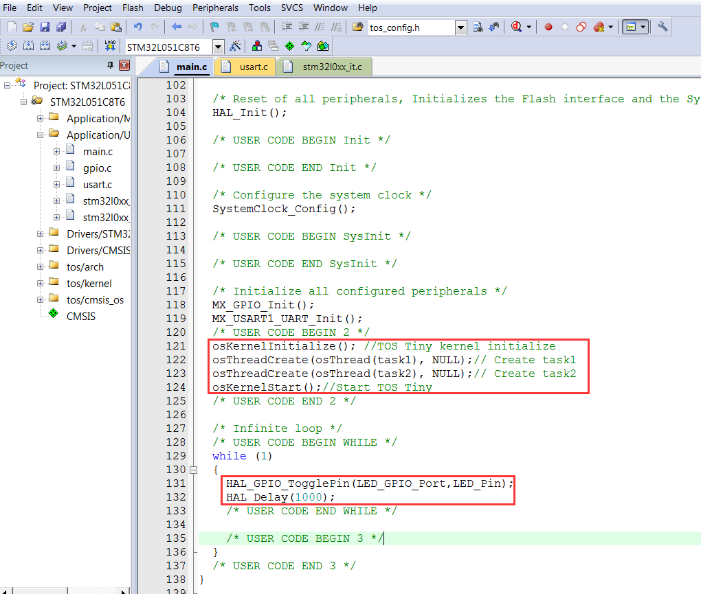 osKernelInitialize(); //TOS Tiny kernel initializeosThreadCreate(osThread(task1), NULL);// Create task1osThreadCreate(osThread(task2), NULL);// Create task2osKernelStart();//Start TOS Tiny
