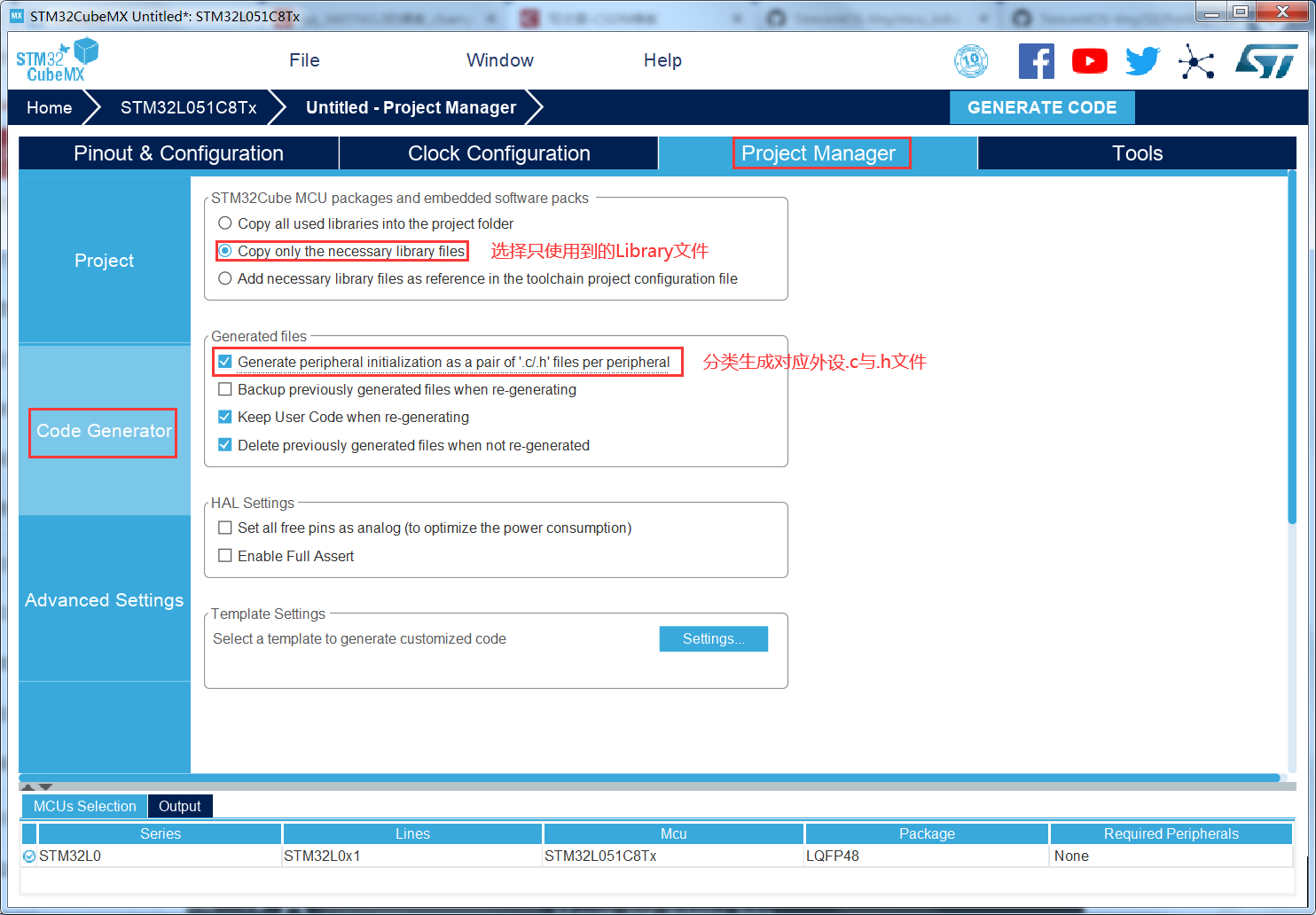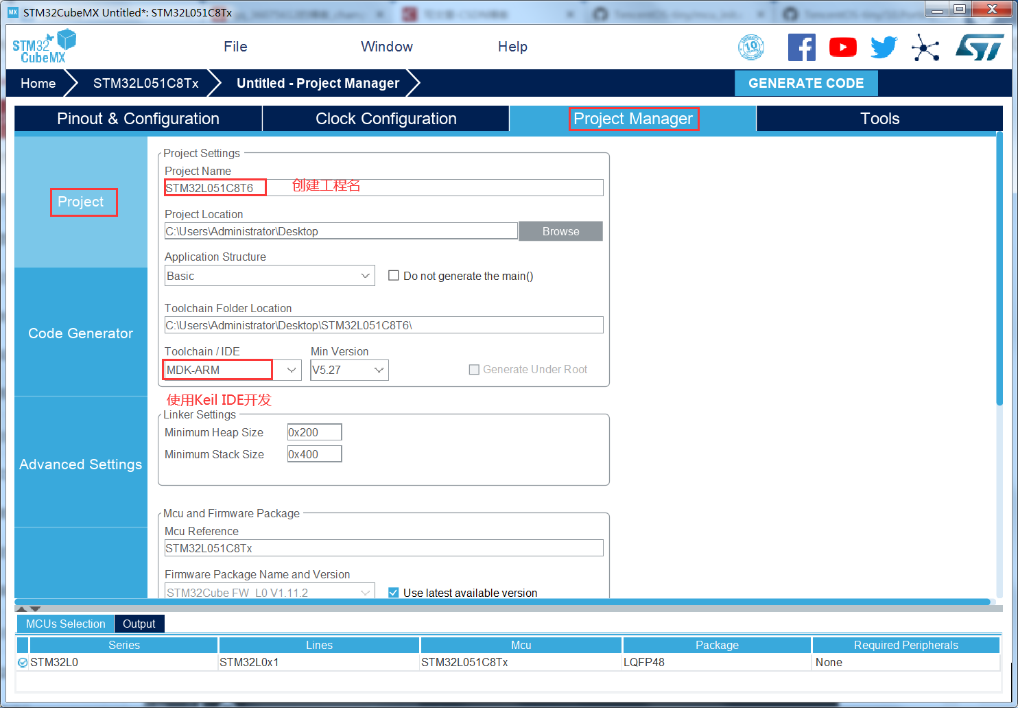 1、使用STM32CubeMx工具生成demo工程,我的工程名叫STM32L051C8T6