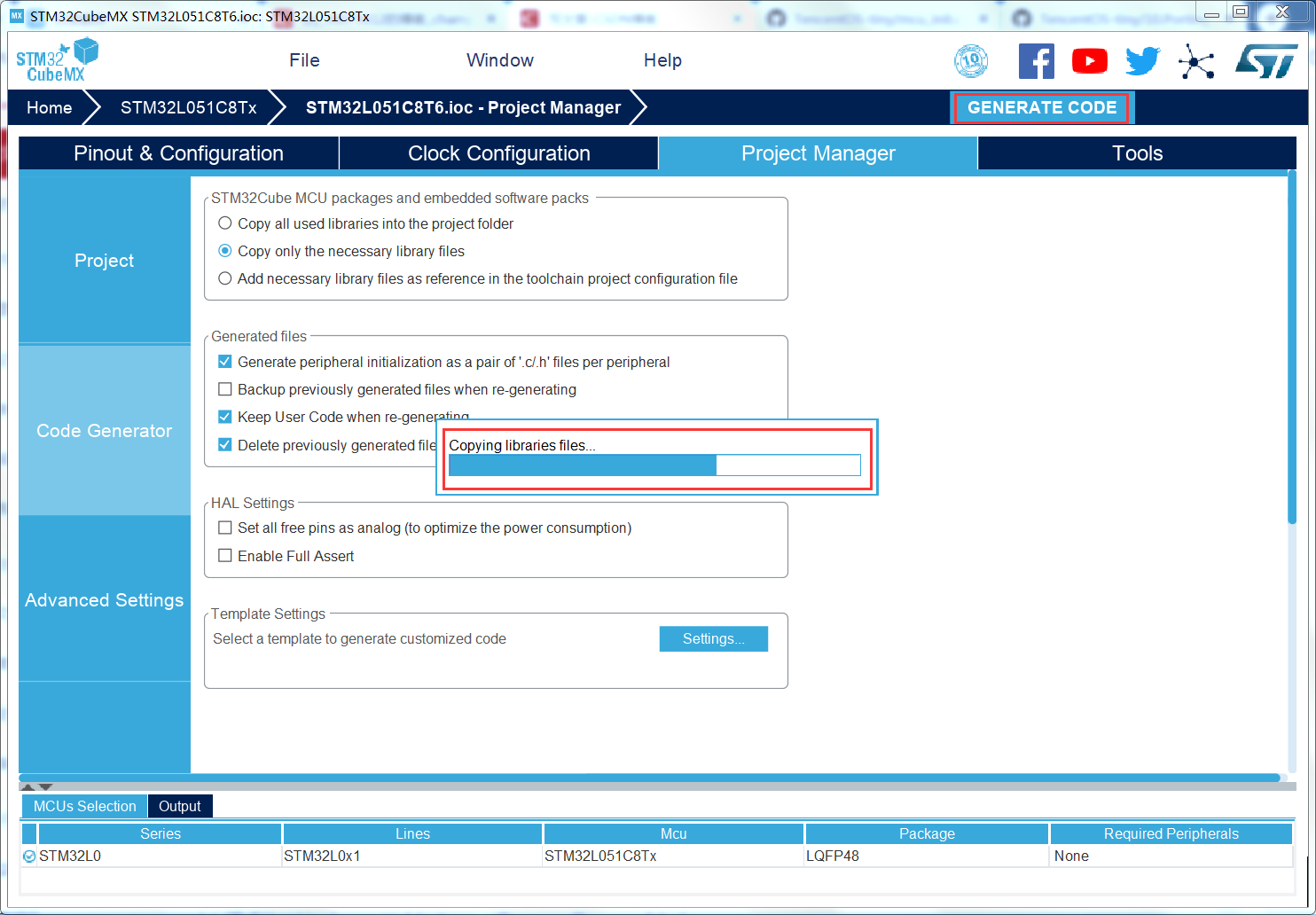 配置好后,接着点击生成代码按键,在当前窗口右上角"GENERATE CODE",点击它即可。