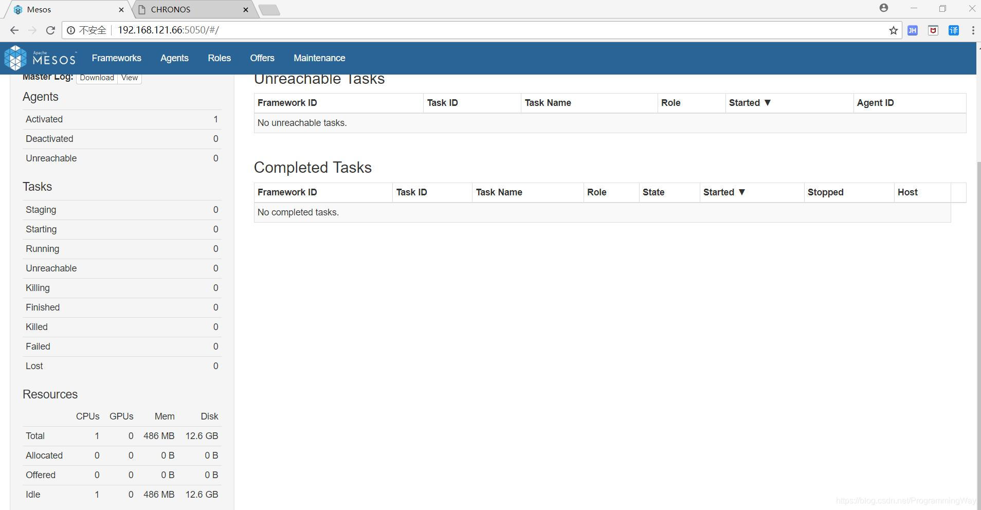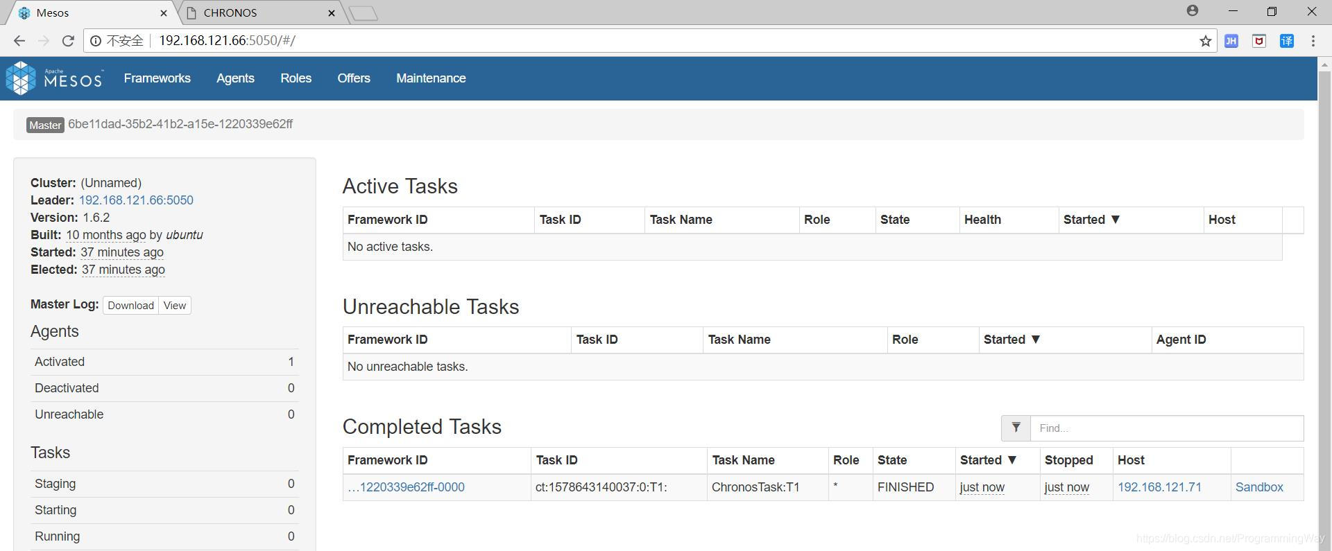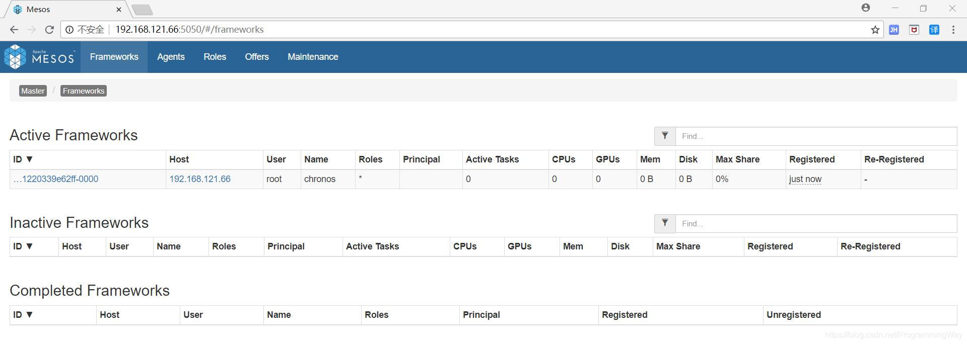 在Mesos Framework中可以看到Active Frameworks的列表里面有Chronos