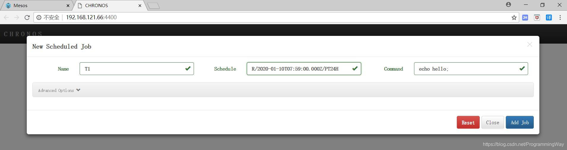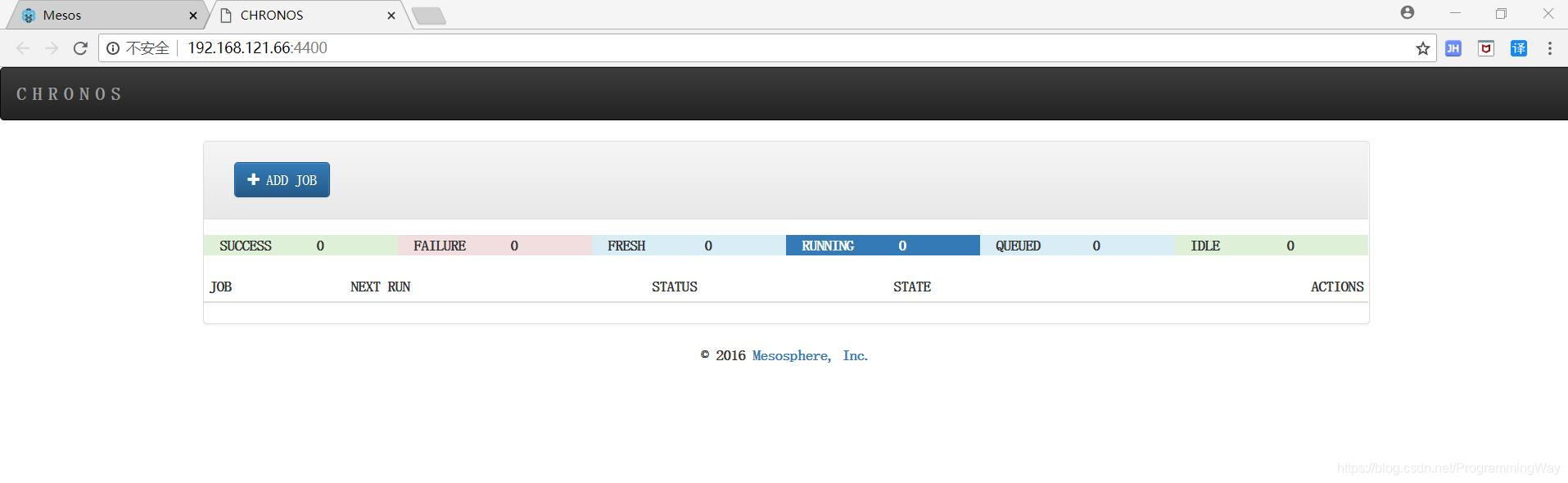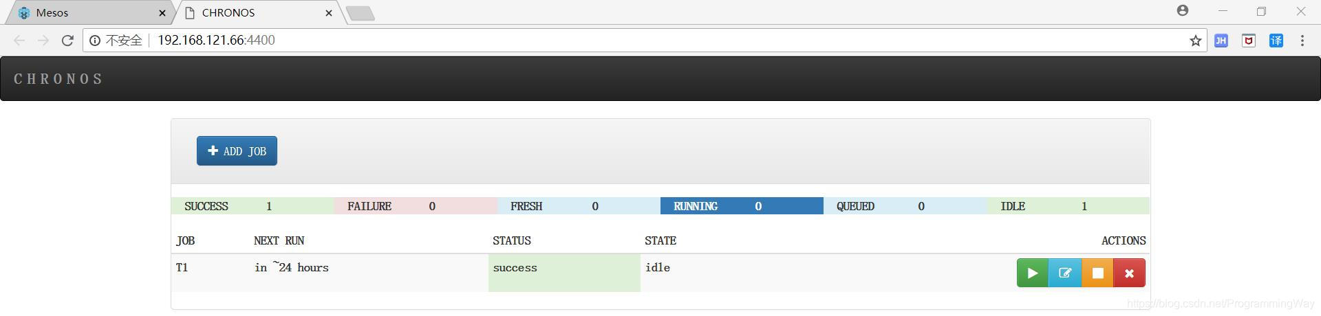 | 1 | CentOS7.0 | 192.168.121.66 | Mesos Master1.6.2 + Zookeeper3.5 + Chronos3.0.2 |