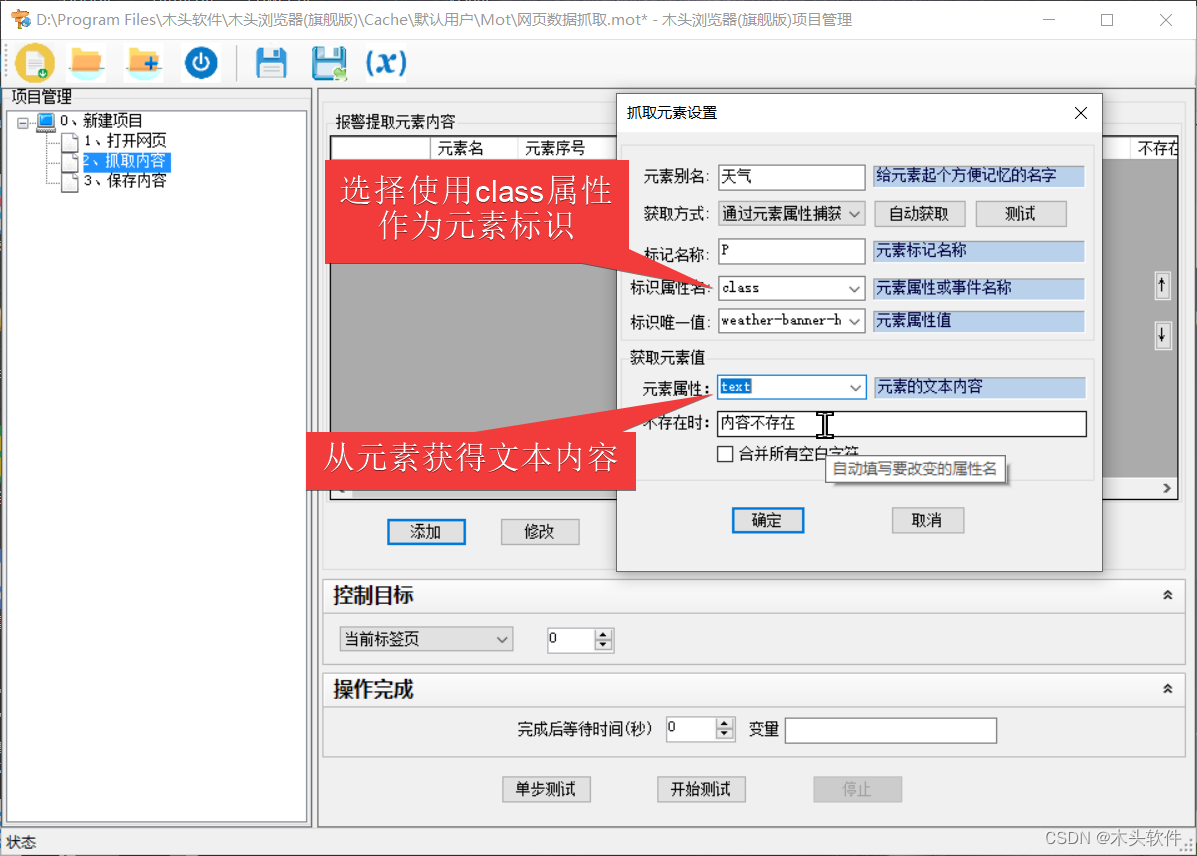5、选择通过【class】属性作为元素标识,抓取元素后获得【text】文本内容。元素别外命名为”天气“。