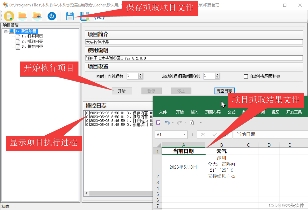 7、最后点击项目管理器工具栏上的保存,保存所有项目设置,下次使用时可直接打开执行项目。点击【开始】按钮执行项目,可以看到项目执行日志,最后打开保存的Excel文档,日期和抓取网页天气信息都保存到表格里了。
