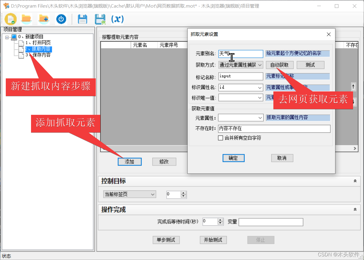 3、再新建【抓取内容】步骤,添加抓取网页元素,点击【自动获取】按钮,浏览器自动进入元素获取模式。
