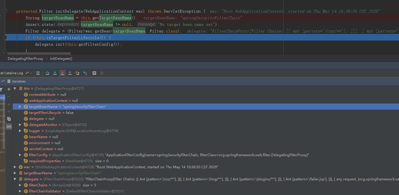 由此可知,DelegatingFilterProxy通过springSecurityFilterChain这个名称,得到了一个FilterChainProxy过滤器,最终在第三步执行了这个过滤器。