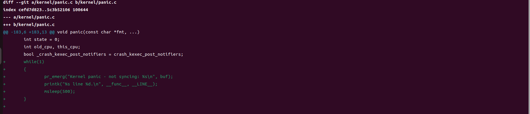 经过测试,如果我们注释掉下面这几行,panic_timeout将会生效。说明之前的测试,可能在进入panic_timeout前进入了导致重启的其他流程。