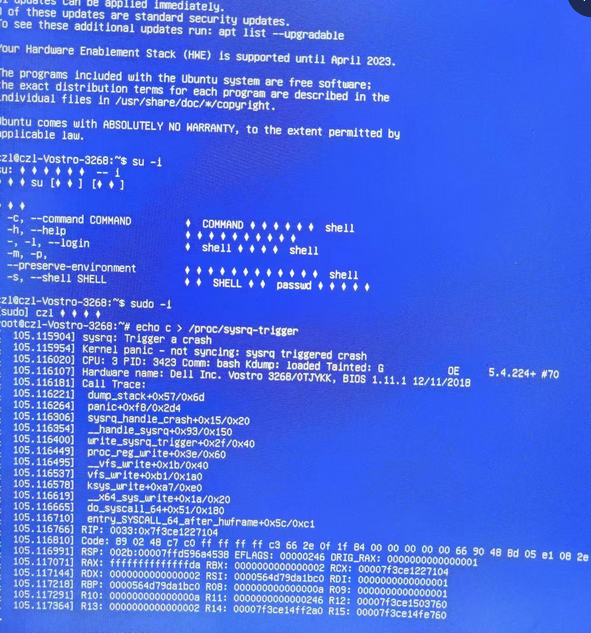 打开/proc/sys/kernel/panic_on_oops测试,触发越界访问的oops导致的panic.PC直接挂死,电脑无反应。