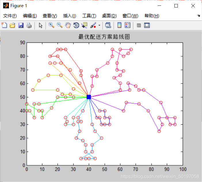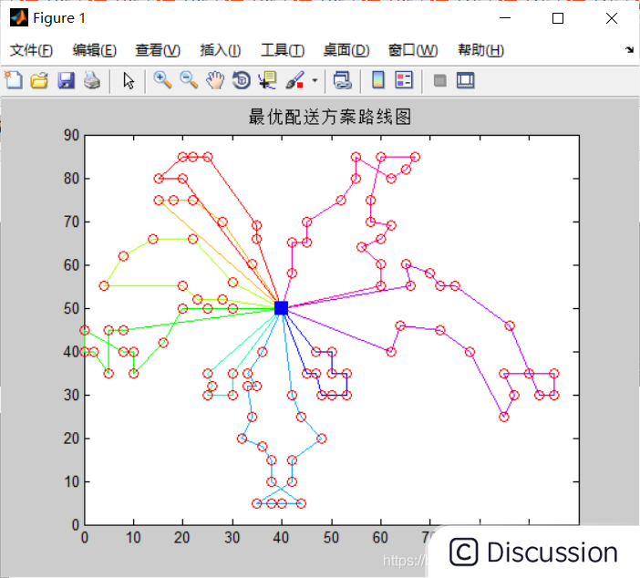 iter=iter+1; end Sbest=dealvehiclescustomer(Sbest); bestNV=size(Sbest,1); bestTD=traveldistance(Sbest,dist); DEL=JudgeDel(Sbest); % 检查最优解中是否存在元素丢失的情况 % 计算每辆车配送路线上在各个点开始服务的时间,还计算返回仓库时间 bsv= beginsv(Sbest,a,s,dist ); [ violateTW ] = JudgeTW( Sbest,bsv,b,L ); % 判断是否违背时间窗约束,0代表不违背,1代表违背 ```