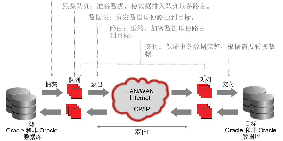 OGG是一种基于日志bai的结构化数据复制软件,通过捕获源数据库online redo log (在线重做日志)或archive log(归档日志)获得数据变化,形成tail(队列文件 ),再将这些tail通过网络协议,传输到目标数据库,目标端通过解析,插入至目标端数据库,从而实现源端与目标端数据同步。