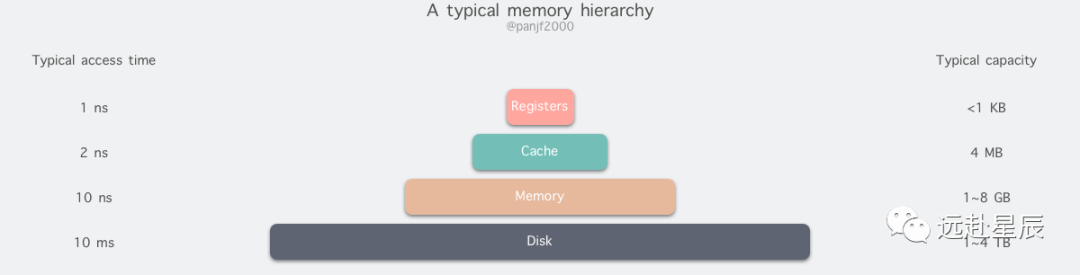 从顶至底,现代计算机里的存储器类型分别有:寄存器、高速缓存、主存和磁盘,这些存储器的速度逐级递减而容量逐级递增。存取速度最快的是寄存器,因为寄存器的制作材料和 CPU 是相同的,所以速度和 CPU 一样快,CPU 访问寄存器是没有时延的,然而因为价格昂贵,因此容量也极小,一般 32 位的 CPU 配备的寄存器容量是 32✖️32 Bit,64 位的 CPU 则是 64✖️64 Bit,不管是 32 位还是 64 位,寄存器容量都小于 1 KB,且寄存器也必须通过软件自行管理。