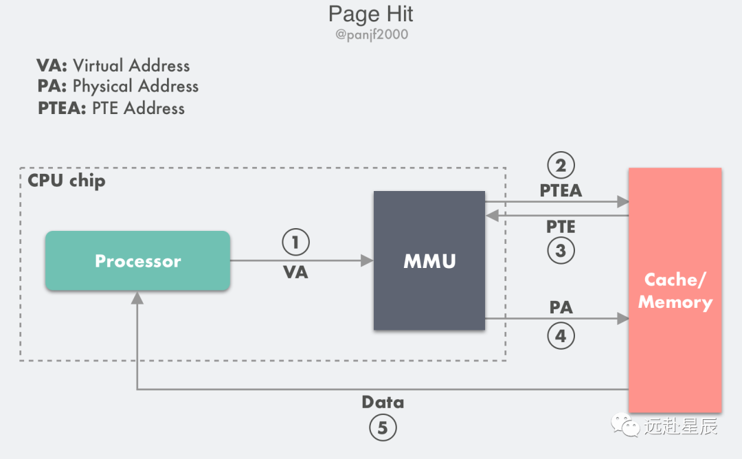 第 4 步:MMU 将这个虚拟地址 VA 翻译成一个真实的物理地址 PA,通过地址总线发送到高速缓存/主存中去;