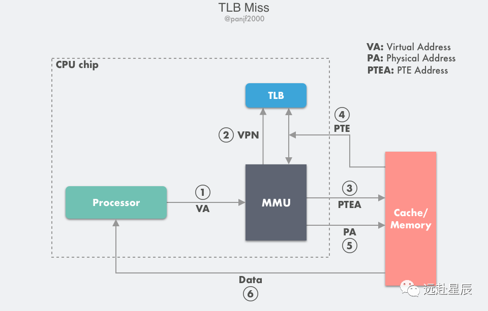 第 2 步至第 4 步:查询 TLB 失败,走正常的主存页表查询流程拿到 PTE,然后把它放入 TLB 缓存,以备下次查询,如果 TLB 此时的存储空间不足,则这个操作会汰换掉 TLB 中另一个已存在的 PTE;