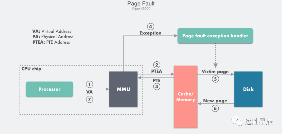 第 7 步:缺页中断程序返回到原先的进程,重新执行引起缺页中断的指令,CPU 将引起缺页中断的虚拟地址重新发送给 MMU,此时该虚拟地址已经有了映射的物理页框号 PPN,因此会按照前面『Page Hit』的流程走一遍,最后主存把请求的数据返回给处理器。