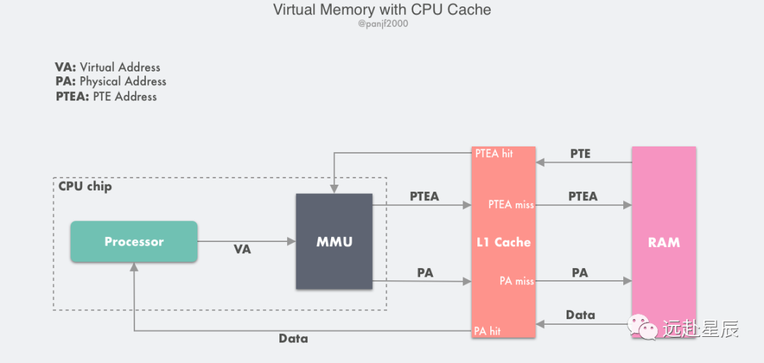 前面在分析虚拟内存的工作原理之时,谈到页表的存储位置,为了简化处理,都是默认把主存和高速缓存放在一起,而实际上更详细的流程应该是如下的原理图: