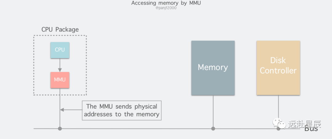 进程在运行期间产生的内存地址都是虚拟地址,如果计算机没有引入虚拟内存这种存储器抽象技术的话,则 CPU 会把这些地址直接发送到内存地址总线上,然后访问和虚拟地址相同值的物理地址;如果使用虚拟内存技术的话,CPU 则是把这些虚拟地址通过地址总线送到内存管理单元(Memory Management Unit,简称 MMU),MMU 将虚拟地址翻译成物理地址之后再通过内存总线去访问物理内存: