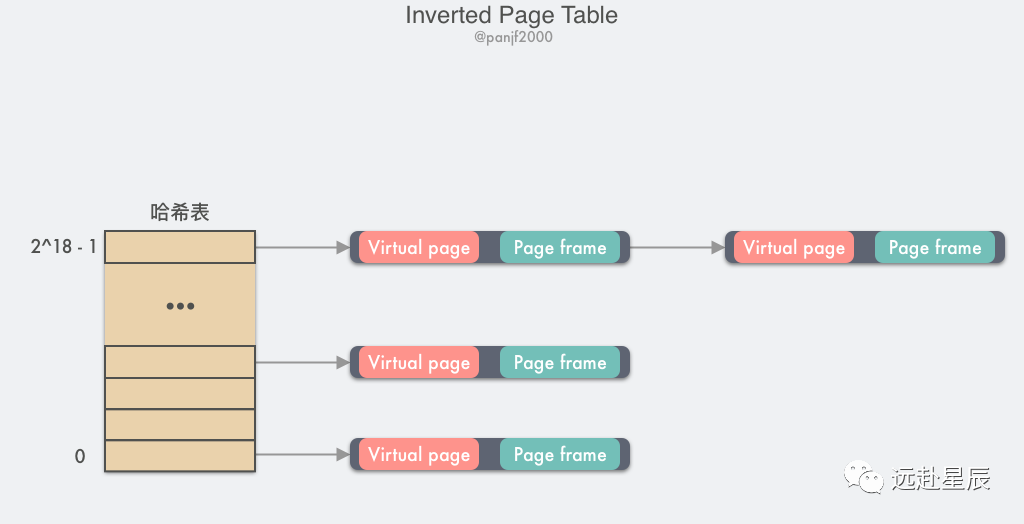 这时候又是我们的老朋友 -- TLB 出场的时候了,我们只需要把高频使用的页面缓存在 TLB 中,借助于硬件,在 TLB 缓存命中的情况下虚拟内存地址的翻译过程就可以像普通页表那样快速,然而当 TLB 失效的时候,则还是需要通过软件的方式去扫描整个倒排页表,线性扫描的方式非常低效,因此一般倒排页表会基于哈希表来实现,假设有 1G 的物理内存,那么这里就一共有 2^18 个 4KB 大小的页框,建立一张以 PPN 作为 key 的哈希表,每一个 key 值对应的 value 中存储的是 (VPN, PNN),那么所有具有相同哈希值的 VPN 会被链接在一起形成一个冲突链,如果我们把哈希表的槽数设置成跟物理页框数量一致的话,那么这个倒排哈希表中的冲突链的平均长度将会是 1 个 PTE,可以大大提高查询速度。当 VPN 通过倒排页表匹配到 PPN 之后,这个 (VPN, PPN) 映射关系就会马上被缓存进 TLB,以加速下次虚拟地址翻译。