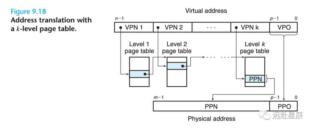比如有个一个 k 级页表,虚拟地址由 k 个 VPN 和 1 个 VPO 组成,每一个 VPN i 都是一个到第 i 级页表的索引,其中 1 <= i <= k。第 j 级页表中的每一个 PTE(1 <= j <= k-1)都指向第 j+1 级页表的基址。第 k 级页表中的每一个 PTE 都包含一个物理地址的页框号 PPN,或者一个磁盘块的地址(该内存页已经被页面置换算法换出到磁盘中)。MMU 每次都需要访问 k 个 PTE 才能找到物理页框号 PPN 然后加上虚拟地址中的偏移量 VPO 从而生成一个物理地址。这里读者可能会对 MMU 每次都访问 k 个 PTE 表示性能上的担忧,此时就是 TLB 出场的时候了,计算机正是通过把每一级页表中的 PTE 缓存在 TLB 中从而让多级页表的性能不至于落后单页表太多。