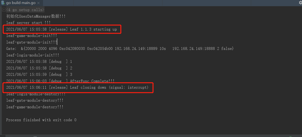 Leaf 首先会在同一个 goroutine 中按模块注册顺序执行模块的 OnInit 方法,等到所有模块 OnInit 方法执行完成后则为每一个模块启动一个 goroutine 并执行模块的 Run 方法。最后,游戏服务器关闭时(Ctrl + C 关闭游戏服务器)将按模块注册相反顺序在同一个 goroutine 中执行模块的 OnDestroy 方法。