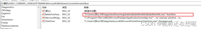 这里是我本机的启动注册表,可以看到有百度云的还有onedrive。这我完全不知情,这也是电脑每次启动都会自己打开百度云的原因。稍后就把它删了......。