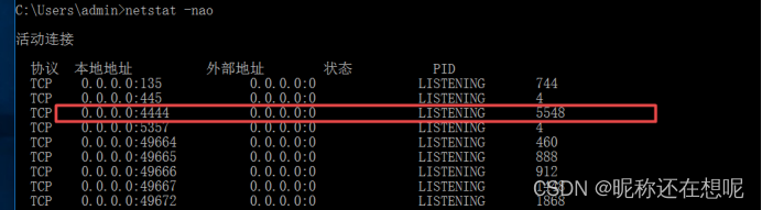 本次测试我们使用第二种连接方式,先在windows监听444端口。执行以下命令。