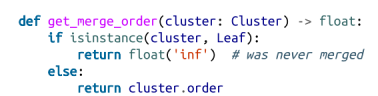 我们将借助合并次序slot来跟踪合并的顺序。这个数字越小,表示合并的次序越靠后。这意味着,当我们想分拆聚类的时候,可以根据合并次序的值,从最小到最大依次进行。由于叶聚类不是合并而来的(这意味着无需分拆它们),因此,我们将它们合并次序的值规定为无穷大: