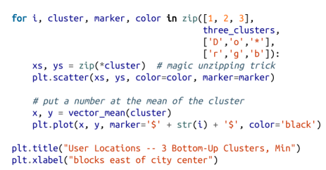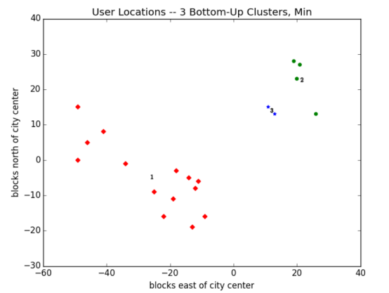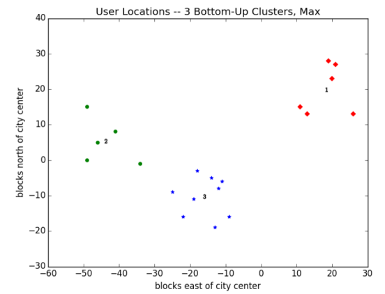 如前所述,这是因为在cluster_distance中使用min往往会给出类似链的聚类。如果我们使用最大值(它给出了紧密的聚类),它看起来与3-means的结果相同(图20-7)