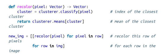 事实上,这个工作非常适合用 k-means 算法来做,因为该算法能够将像素划分为红 - 绿 - 蓝空间中的五个聚类。之后,我们只要将这些聚类中的像素用其中间色来重新着色就可以了。