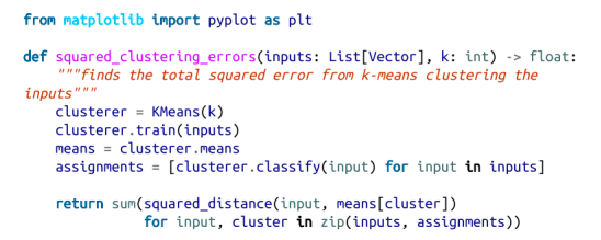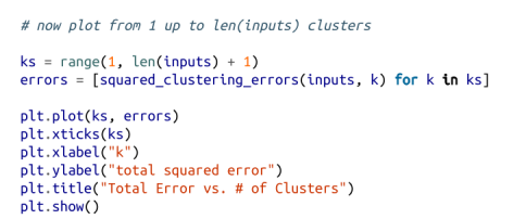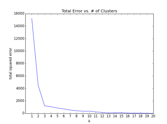 在前一个例子中,聚类数目 k 的选择是由外部因素决定的,我们无法控制。但是通常情况下,事情并非如此。k 的选择方法可谓五花八门,一个比较易于理解的方法是以误差(即每个数据点到所在聚类的中心的距离)的平方之和作为 k 的函数,画出该函数的图像,并在其“弯曲”的地方寻找合适的取值: