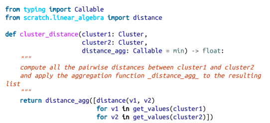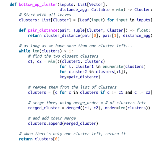 以上的 bottom_up_clustering 的实现代码相对来说已经很简单了,但是计算效率依然低得吓人。特别是,在每一步它都要重新计算每对输入之间的距离。更有效的实现方法是,预先算出每对输入之间的距离,然后在 cluster_ distance 里面进行查找。一个真正高效的实现方法可能还需要存储上一步的cluster_distance。