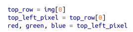 这里,img[i][j] 表示第 i 行第 j 列的像素,并且每个像素都由一个取值范围介于 0 和 1 之间的 [red, green, blue] 数字列表来指定其颜色: