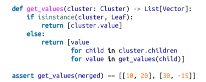 我们将稍微讨论合并顺序,但首先创建一个辅助函数,递归地返回(可能合并的)聚类中包含的所有值: